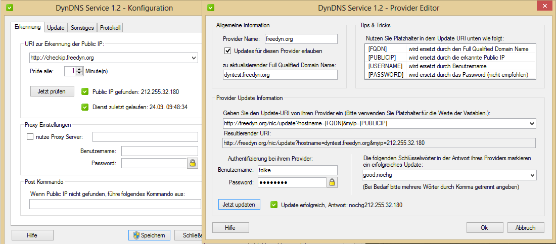 Hier die Einstellungen für die Windows Freeware DynDNS Service 1.2. Als Erkennungsdienst für die öffentliche IP kann http://checkip.freedyn.org verwendet werden.