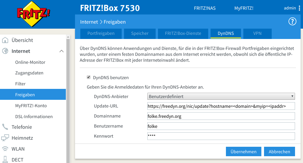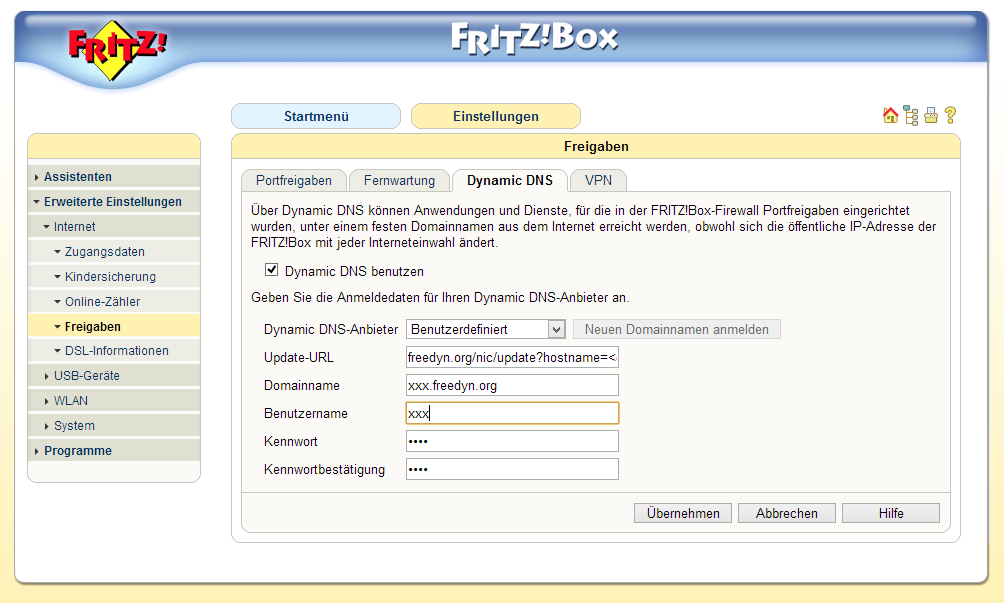FreeDyn.org ist genauso zu bedienen wie der bekannte Anbieter dyndns.org, allerdings müssen die Updates natürlich an den FreeDyn.org Server geschickt werden. Dazu ist es notwendig, dass dein Router das Eintragen eines eigenen Dynamischen DNS Dienstes unterstützt.